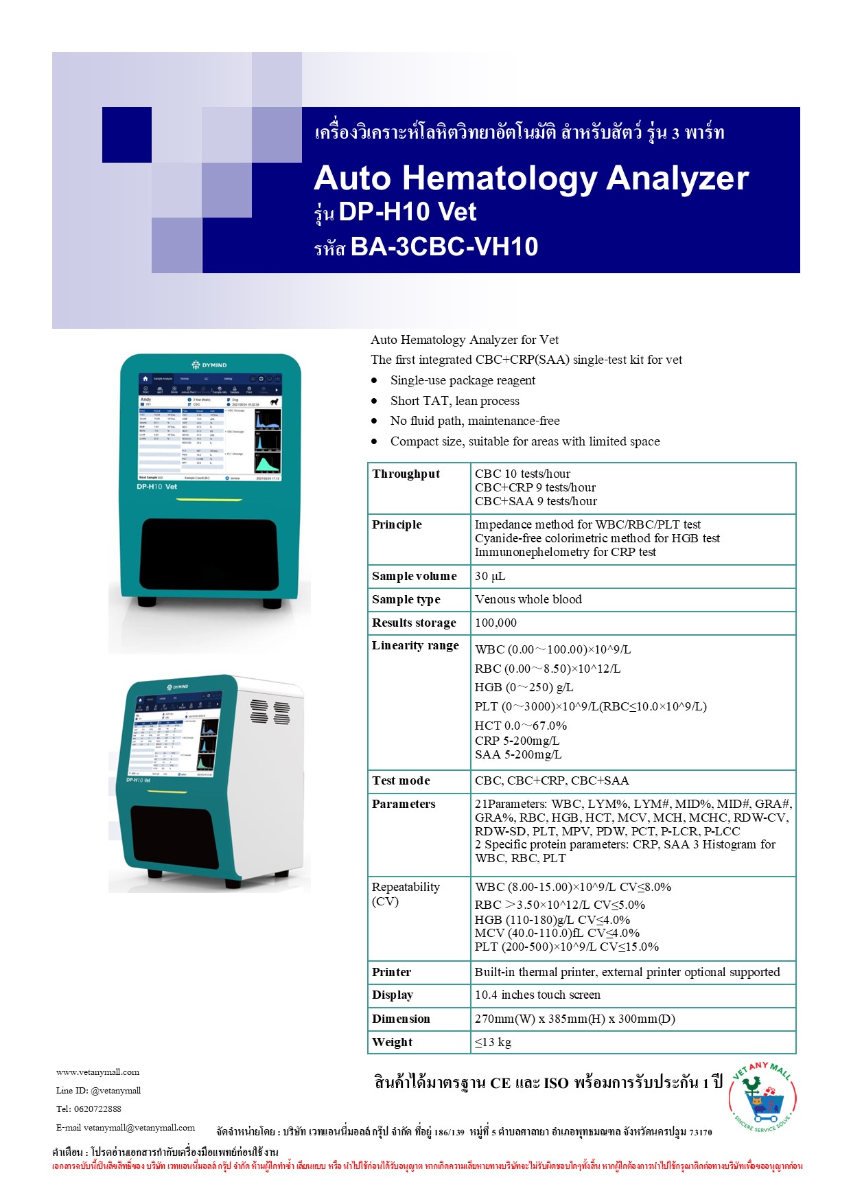 เครื่องวิเคราะห์โลหิตวิทยาอัตโนมัติ สำหรับสัตว์ รุ่น 3 พาร์ท