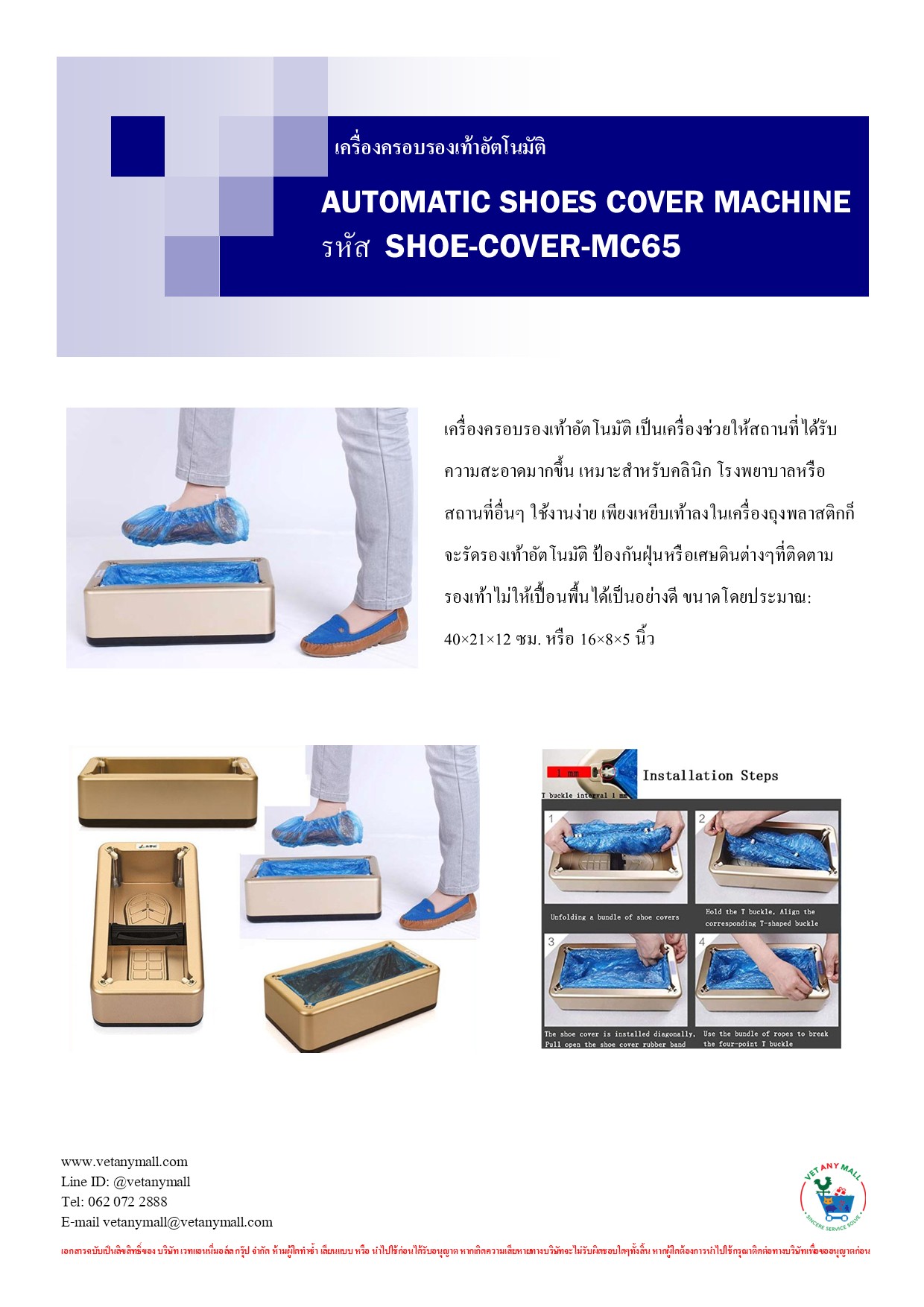 เครื่องครอบรองเท้าอัตโนมัติ เป็นเครื่องช่วยให้สถานที่ได้รับ ความสะอาดมากขึ้น เหมาะสำหรับคลินิก โรงพยาบาลหรือสถานที่อื่นๆ ใช้งานง่าย เพียงเหยีบเท้าลงในเครื่องถุงพลาสติกก็ จะรัดรองเท้าอัตโนมัติ ป้องกันฝุ่นหรือเศษดินต่างๆที่ติดตาม รองเท้าไม่ให้เปื้อนพื้นได้เป็นอย่างดี ขนาดโดยประมาณ: