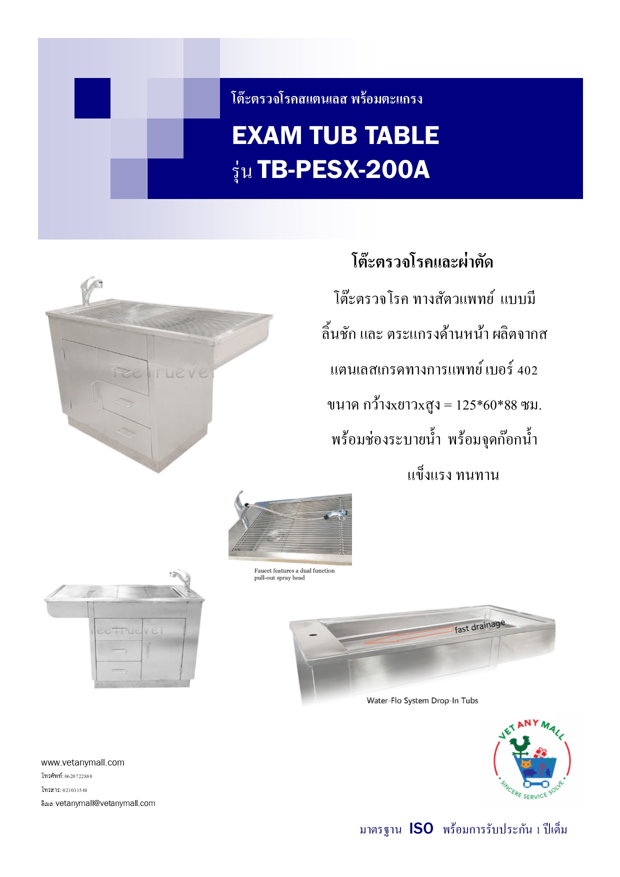 โต๊ะตรวจโรค ทางสัตวแพทย์ แบบมี ลิ้นชัก และ ตระแกรงด้านหน้า ผลิตจากส แตนเลสเกรดทางการแพทย์ เบอร์ 402